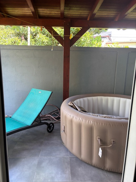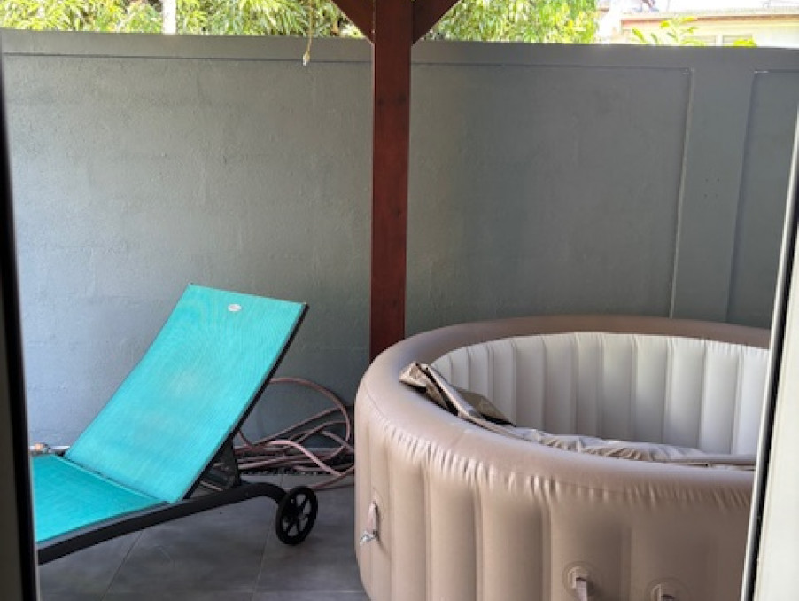 Maison mitoyenne 2P, entièrement meublée et équipée comprenant une cuisine ouverte sur séjour, une chambre, une salle d'eau, une arrière terrasse avec jacuzzi et une terrasse