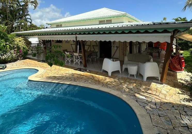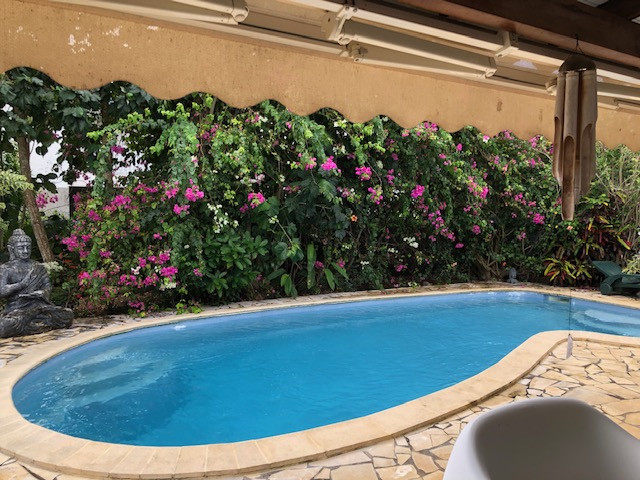 Villa 4P avec piscine, garage et 2 bungalows sur un terrain de 813m². La maison principale comprend un grand séjour avec cuisine ouverte, 2 chambres, un bureau, un salle d'eau, un WC indépendant, une grande terrasse donnant sur une agréable piscine sans vis a vis, un grand garage avec WC et buanderie et 2 bungalows en bois avec chacun cuisine extérieur sur terrasse et une chambre climatisée avec salle de douche et WC